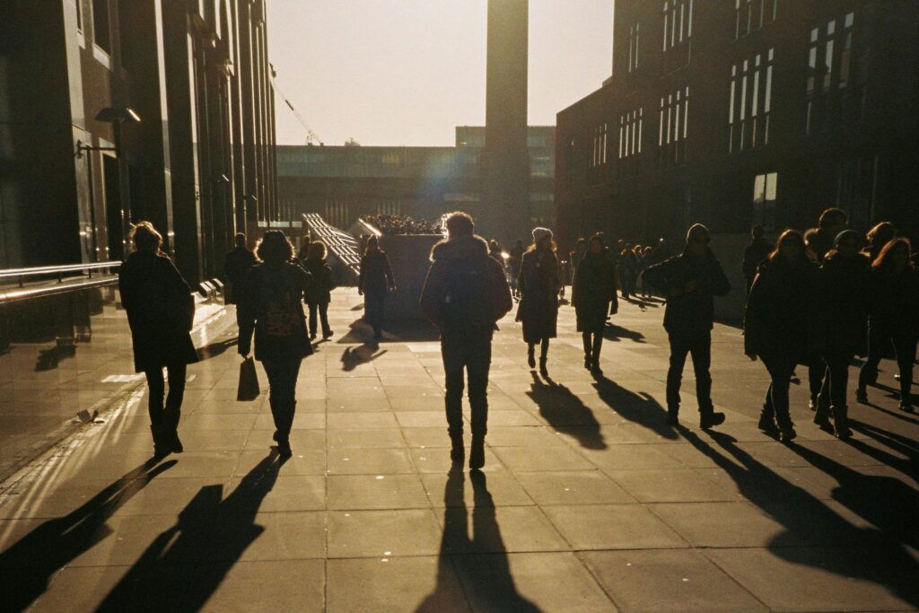 Joukko ihmisiä kävelee kaupungin kadulla auringon noustessa.