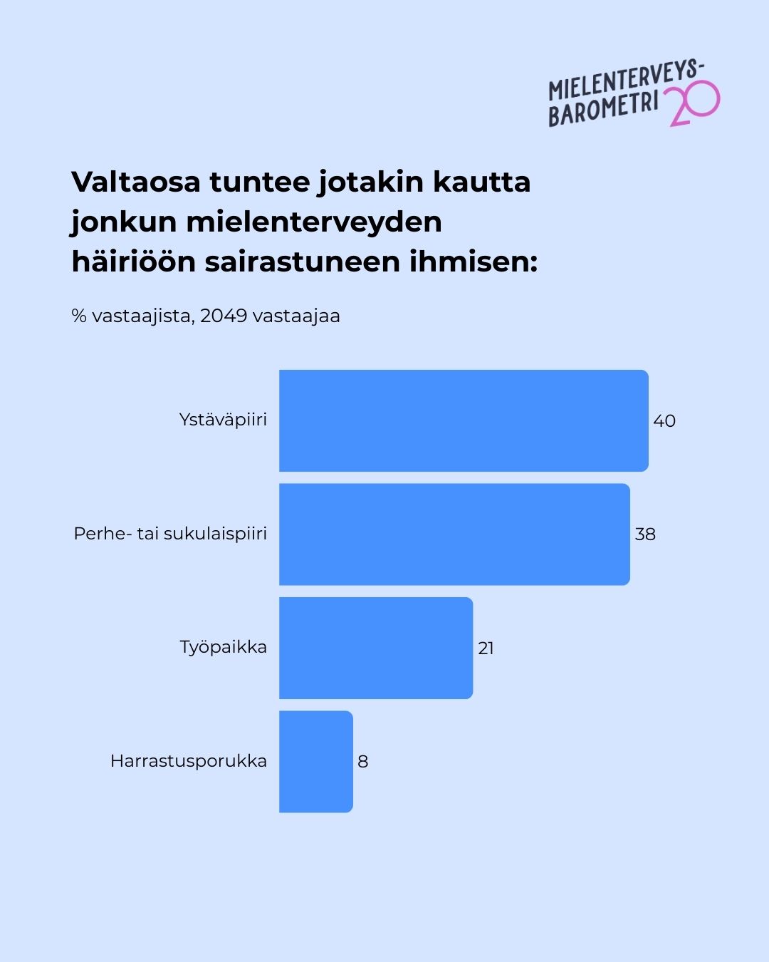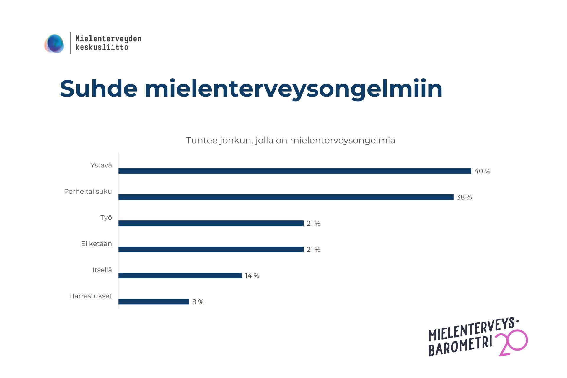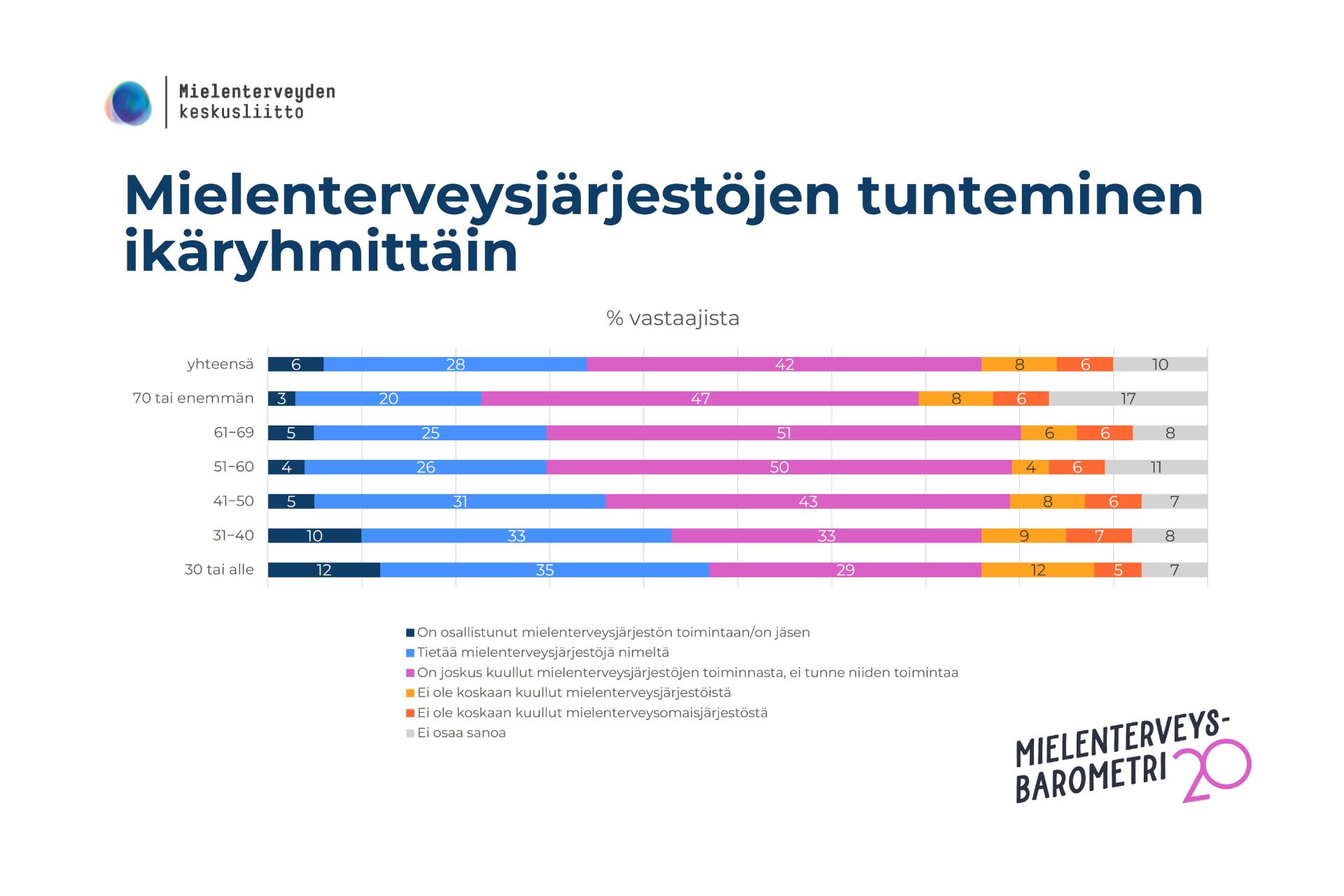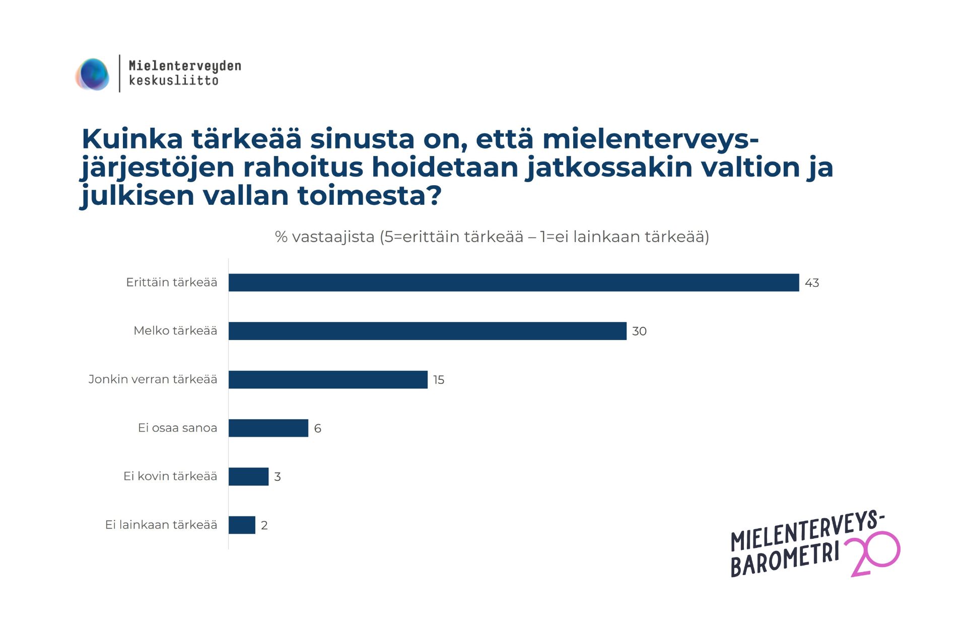 43 % suomalaisista pitää mielenterveysjärjestöjen julkista rahoitusta erittäin tärkeänä. Aktiivisimmin järjestöjen toimintaan osallistuvat nuorimmat ikäluokat.