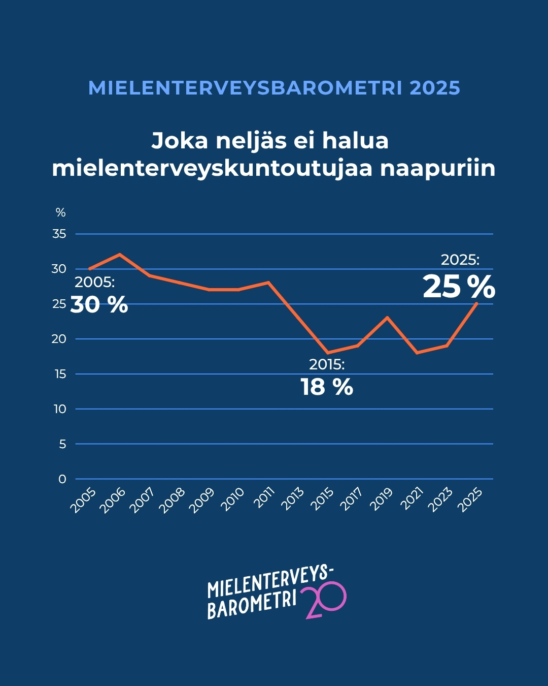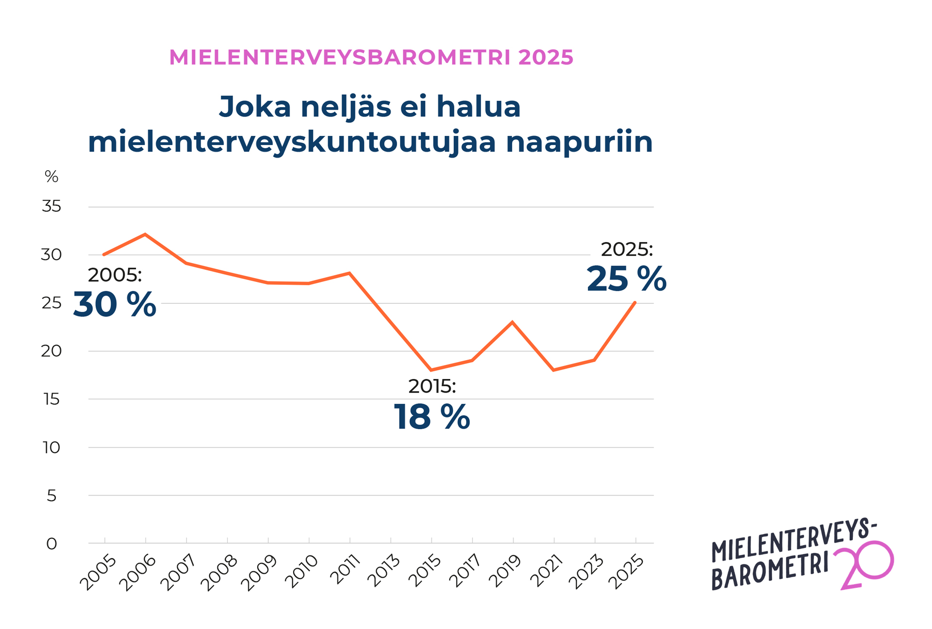Uuden Mielenterveysbarometrin mukaan asenteet mielenterveysongelmia kohtaan ovat negatiivisempia kuin 14 vuoteen. Barometrin ns. Nimby-mittarin (Not in my backyard) mukaan 25 % vastaajista ei halua mielenterveyskuntoutujaa naapuriinsa.